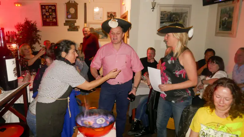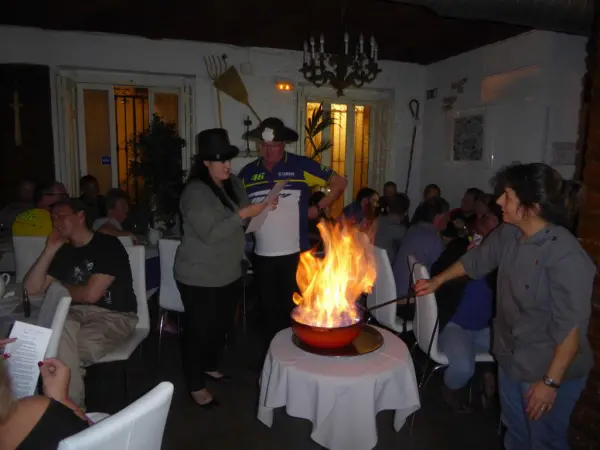 We take over a classic Galician restaurant to celebrate both the end of a great weekend and toast the new world champions. On top of the beer and wine, we sample Galician Queimada from the flaming cauldron brought in for the occasion. The meal is delightful, and after the usual rounds of thanks and congratulations to our sponsored riders the evening devolves into warm and happy haze... Anyone still standing is invited to join us for a little bit of a pub crawl later -- we have been known to end up at the riders' party! We provide the transport from each of our package hotels to the event. Price includes food, transport there and table wine/beer. Included with Deluxe package, other package guests may book at discount.